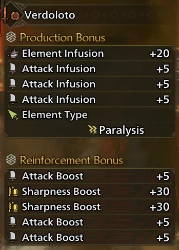 | Blade, Paralysis, Attack | Tube, Paralysis, Attack | Disc, Paralysis, Affinity | 200 Attack, 10% Affinity 8 base Paralysis |
