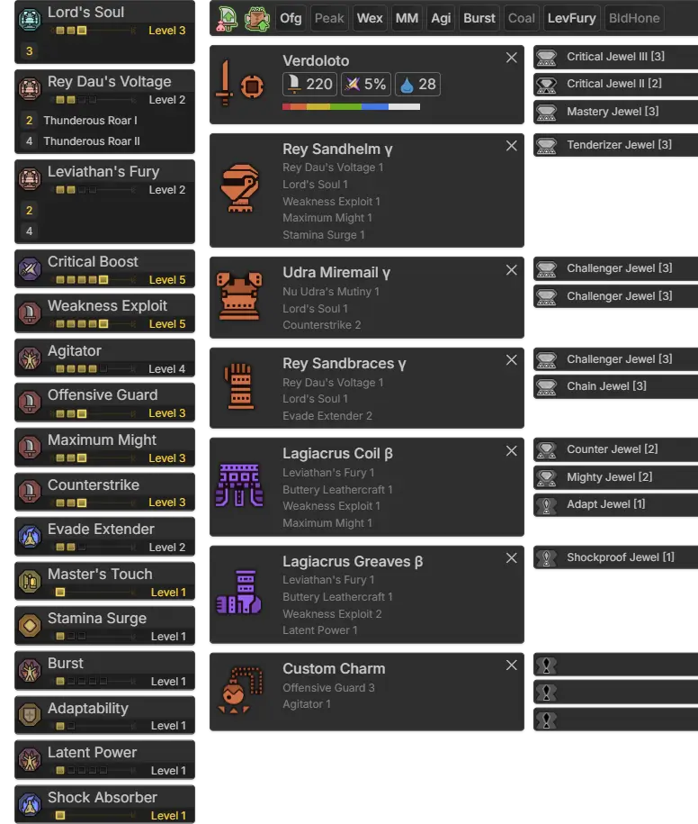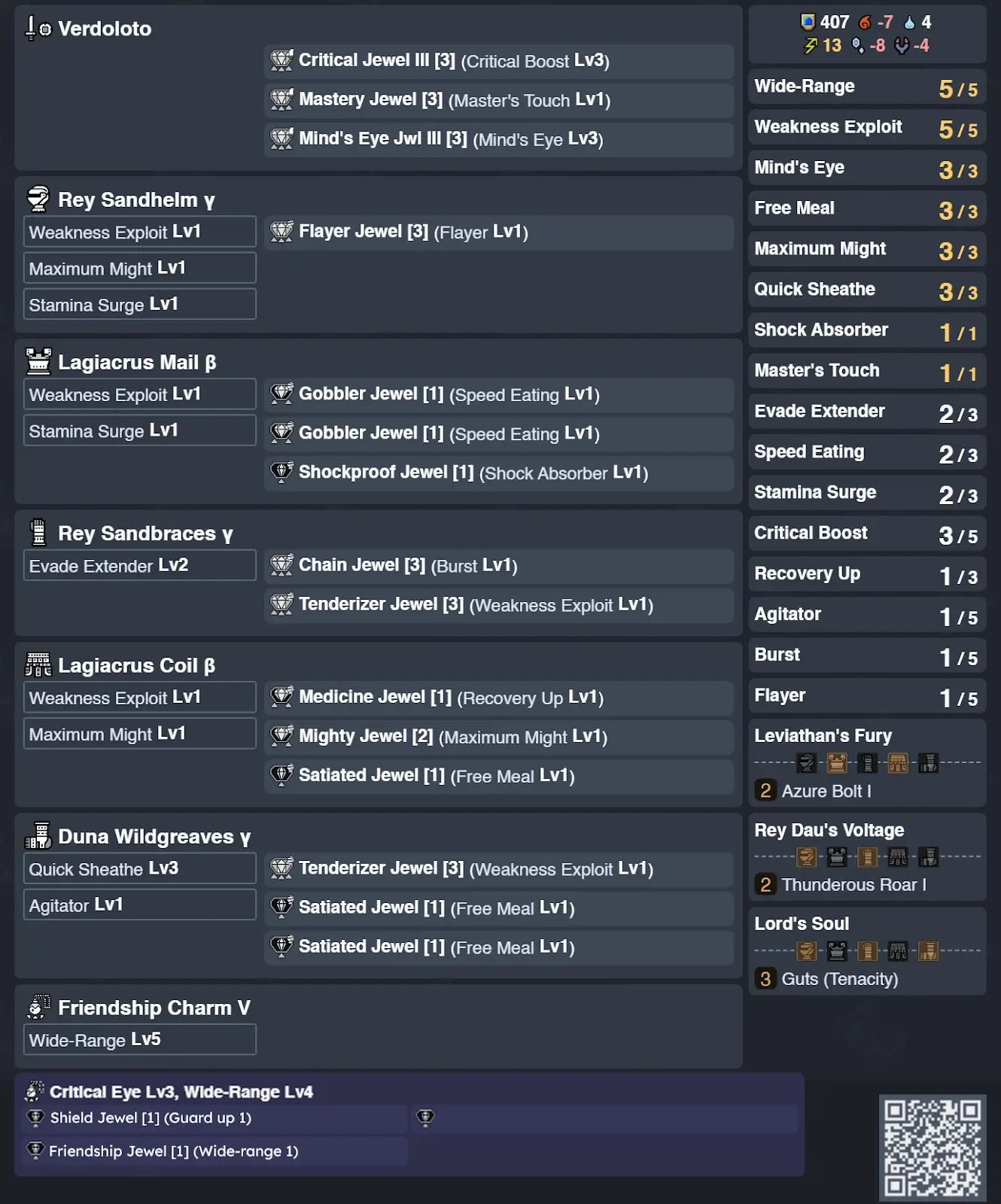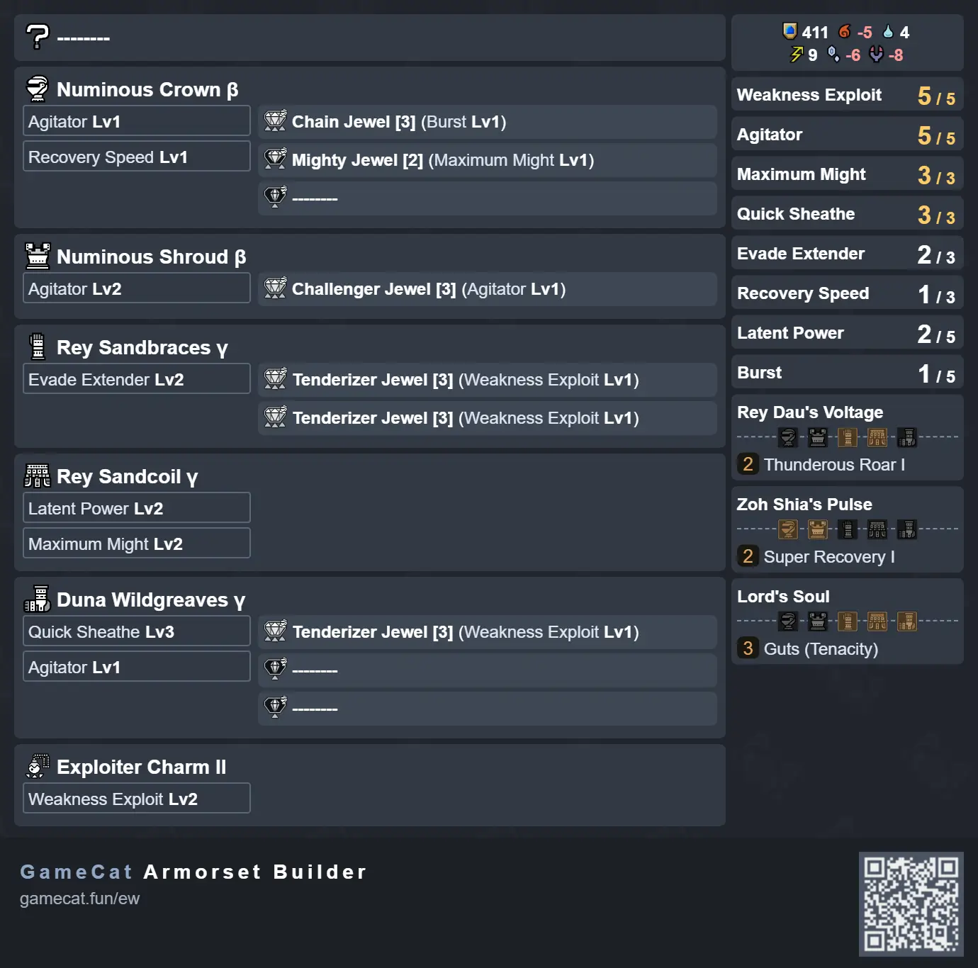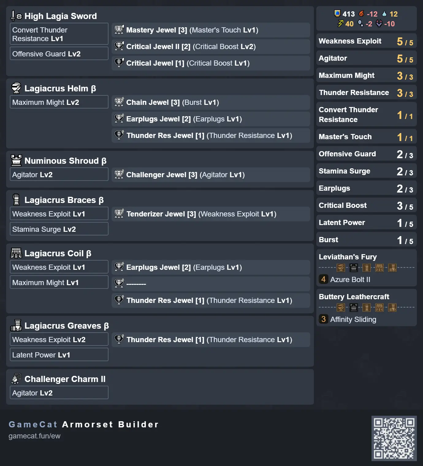 Alternative build (mhwildshub, opens in new tab) using Lagi 2P to trade 1 Agitator for Evade Extender 2, Mirewalker 1 and Leviathan’s Fury set bonus. Evade Extender can be good or bad depending on the matchup.