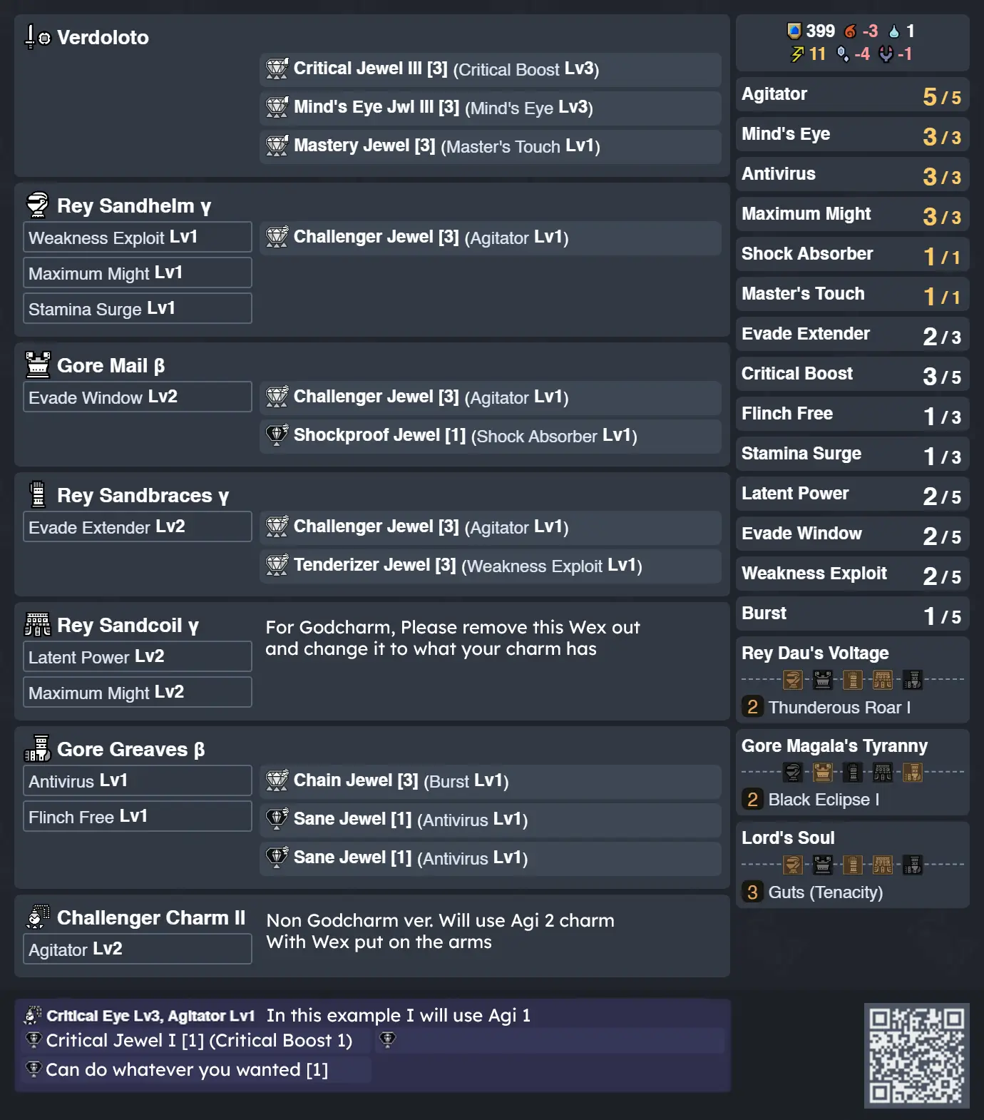 Alternative build (mhwildshub, opens in new tab) that adds Counterstrike 3 but loses 1-2 Latent Power, Evade Extender 2, and Evade Window 1. Requires a good charm (Mastery/Mind’s Eye 3/Crit Eye 3) with armor slots to fit the 3rd Sane jewel.