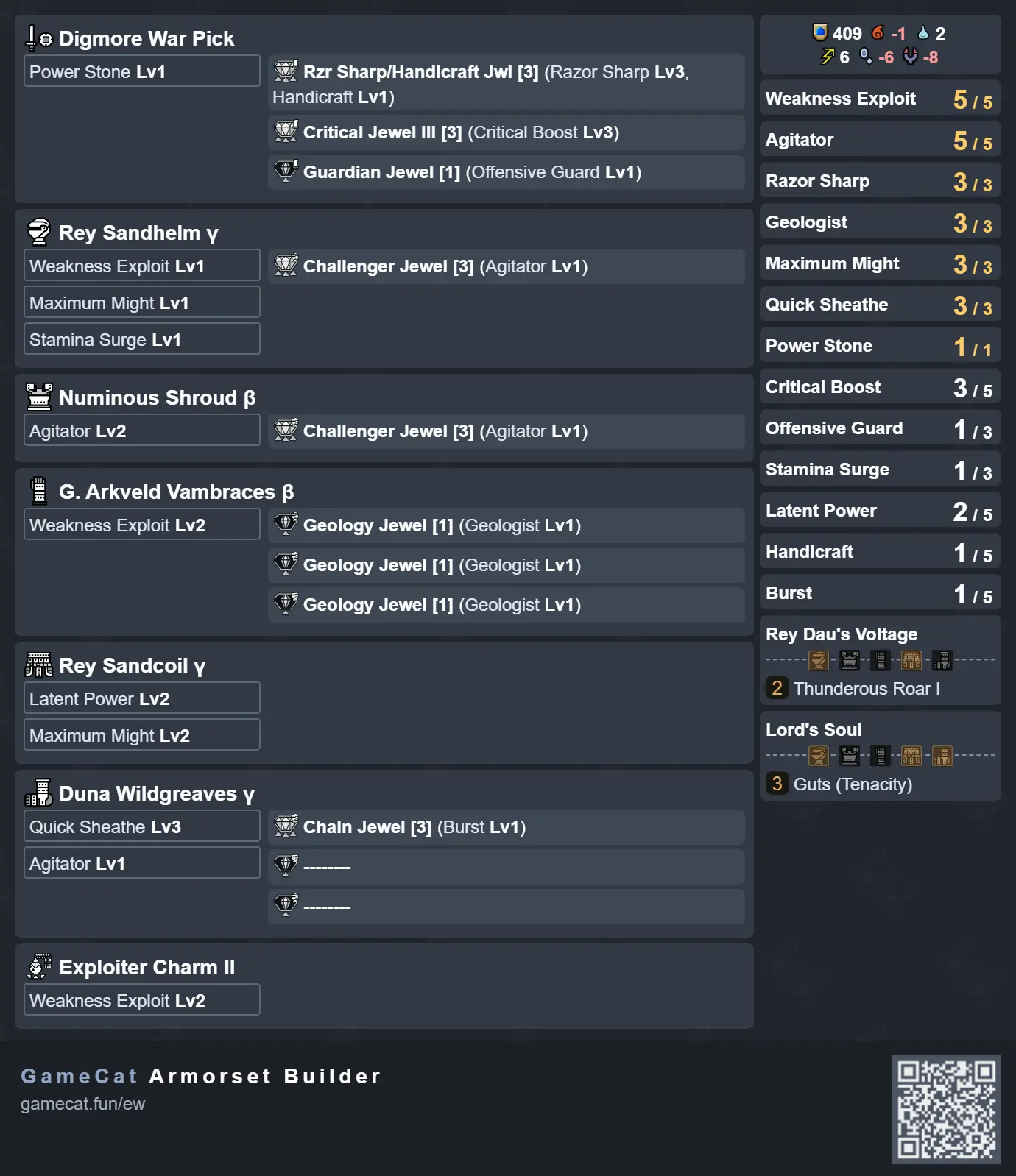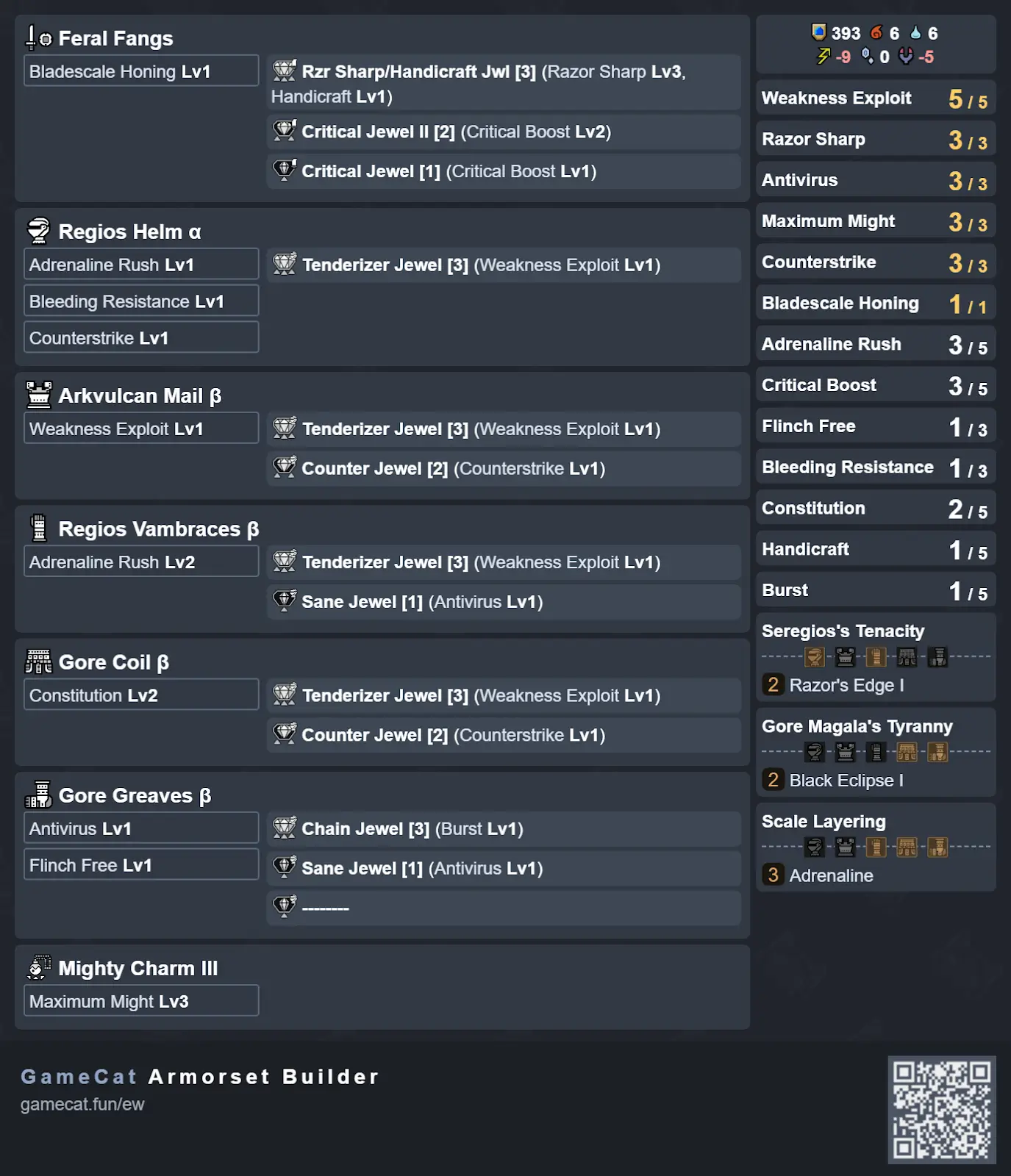 | 1 | Weakness Exploit 5 | Crit, even when nerfed from World and Rise, is still our strongest damage amplification option, over boosting attack or elemental attack. Critical Boost is still a really strong skill even when divided into 5 parts. WEX 5 outperforms Burst 5 when we take into account Critical Boost and Master’s Touch. Maximum Might gives similar values to WEX but is more conditional. Changes to Maximum Might in Wilds let the skill stay active more often, as it now activates after 3s of full stamina and stays active through one dodge move (roll/backhop). Maximum Might is still worth using even when Perfect Guards cause it to deactivate. Black Eclipse and Antivirus adds on 25% more crit and is not hard to use (15% from clearing frenzy and +10% extra from Antivirus 3). |