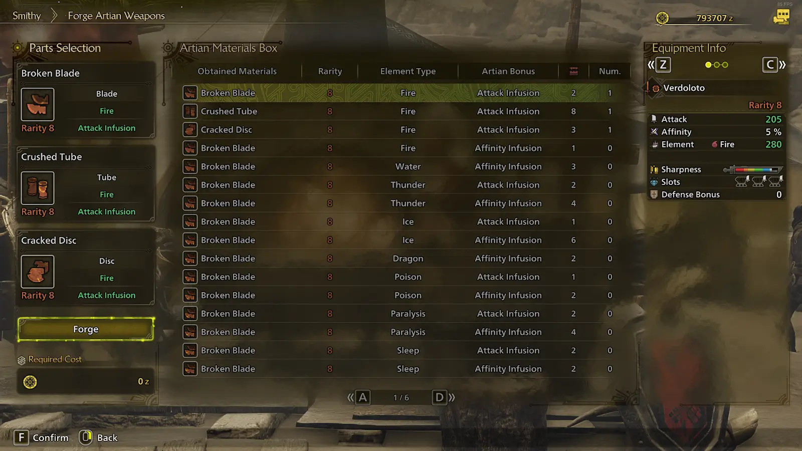 The above example uses 3 Attack Infusions which means the resulting weapon will have 190 + (3x5) Attack and 5% Affinity.