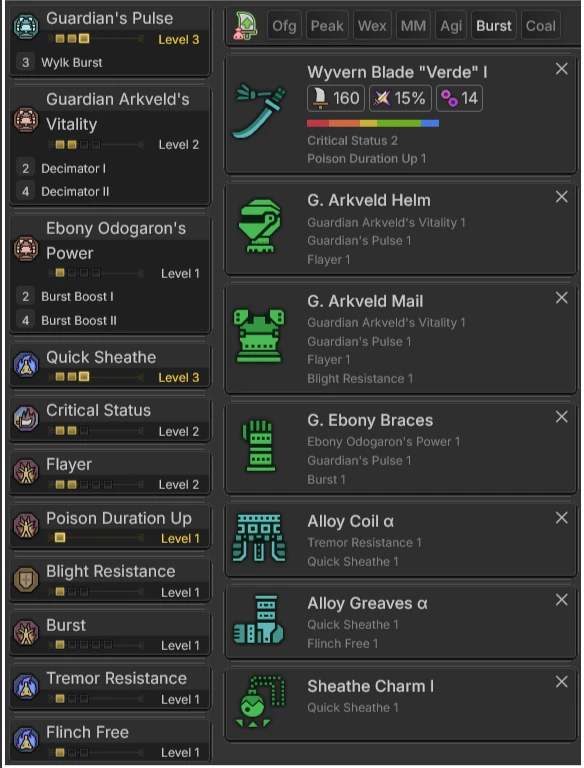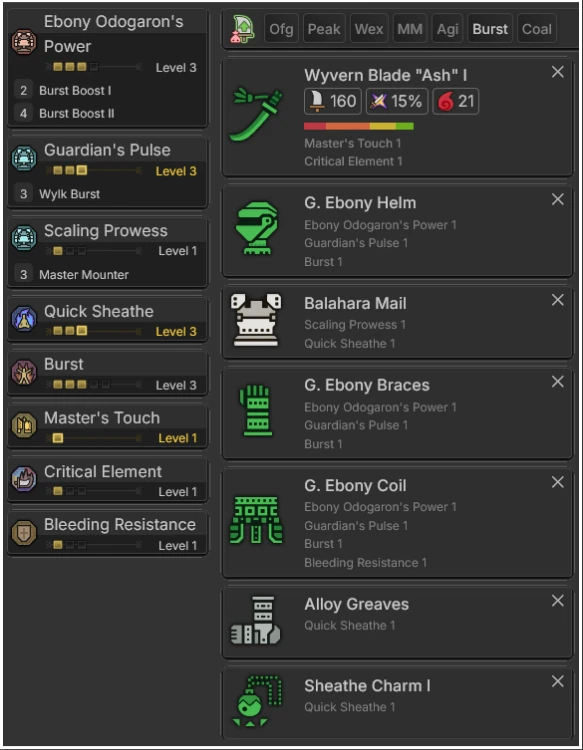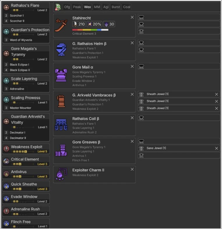 Gore Magala unlocks after hunting Jin Dahaad and the other Apexes, and its set bonus with Antivirus 3 gives a nice 25% affinity. Only a single Quick Sheathe decoration is considered for now, but slot any decent decorations you have. If you still don’t have a QS deco yet for some reason, swap Ebony Helm for Alloy.